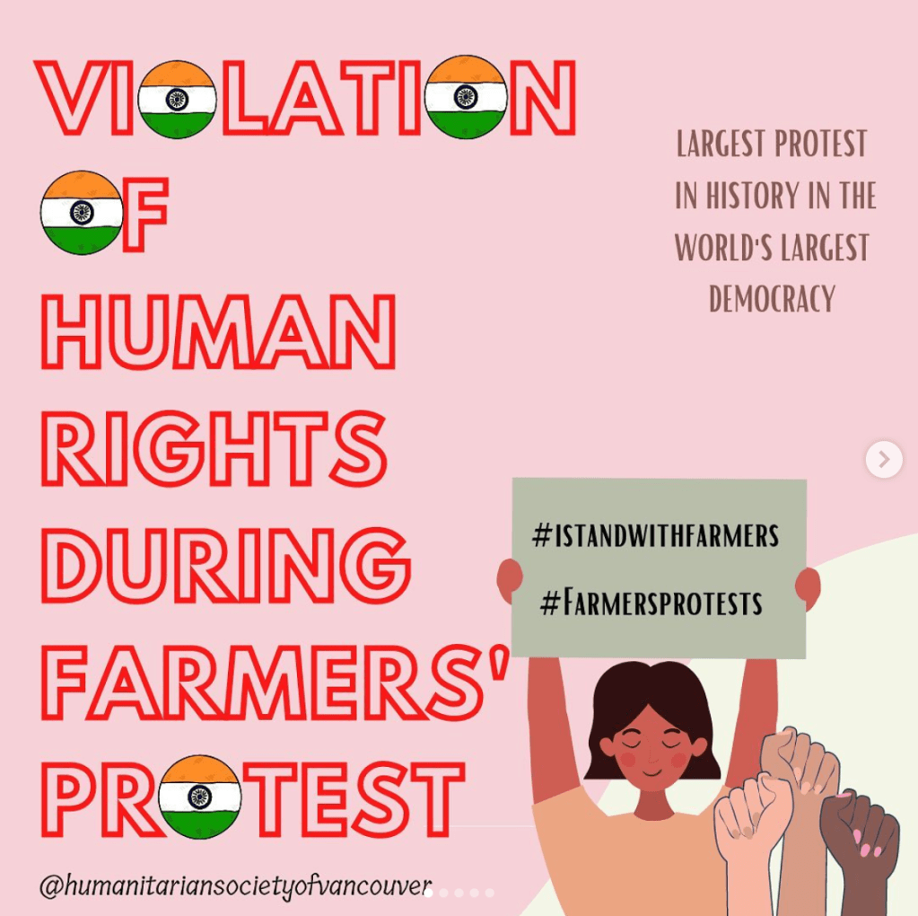 As the farmers’ protest takes place in India, the world’s largest democracy, many domestic and international human rights have been violated by the Indian government and the Indian police force. The farmers have been peacefully protesting for months in India’s capital, Delhi, against the three farms bills passed by the BJP party. The bill includes laws such as privatization of agriculture and removal of Minimum Support Price which many small farmers are afraid will hurt them in long-run. The Indian government has used police brutality, water cannons, tear gas and road blockades such as concrete walls and barbed wires to suppress the protestors. They have cut off internet at protest sites around Delhi, have charged many activists and journals unlawfully, and also cut off protestors’ access to sanitation, food and water. These unlawful tactics have created a very hostile and unsafe environment for the protestors as they fight to raise their voices against the government. #IStandWithFarmers #FarmersProtest