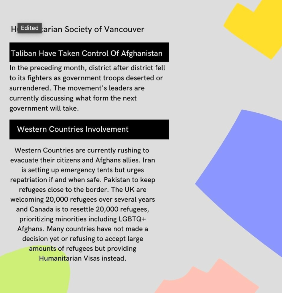 Currently Afghanistan is going under a crisis, where thousands of Afghans are seeking refuge and shelter from the dangers the Taliban present in Afghanistan. It is said by the Taliban that they have changed, but many Afghans, disagree as multiple countries around the world are racing to figure out a way to help. Please take this time to find ways to donate that will help Afghani refugees.
